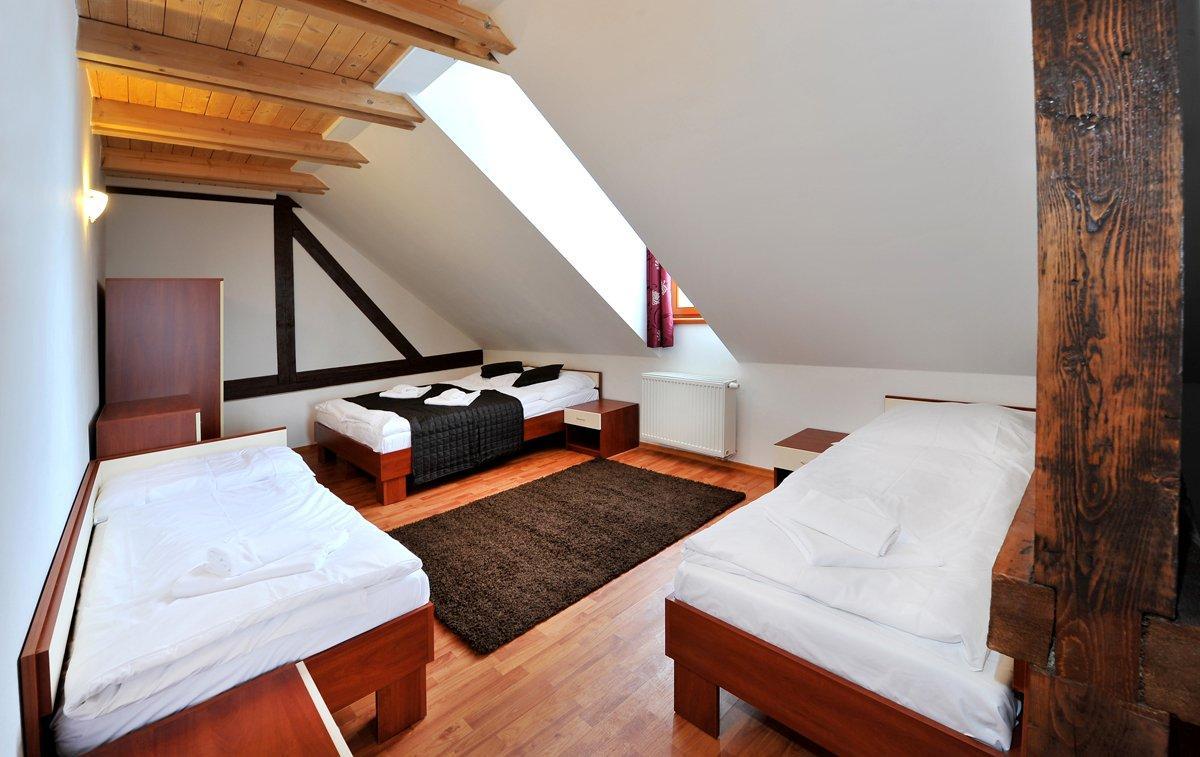 místnosti s manželskou postelí + rozkládací pohovkou, konferenčním